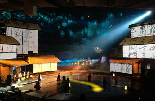 此部話劇成功之處在于實景山水演出,以話劇為核心,綜合聲光電及舞臺機(jī)械,完美地以多媒體圖像做為舞臺背景及地幕,根據(jù)情節(jié)烘托多層幕布的氛圍。