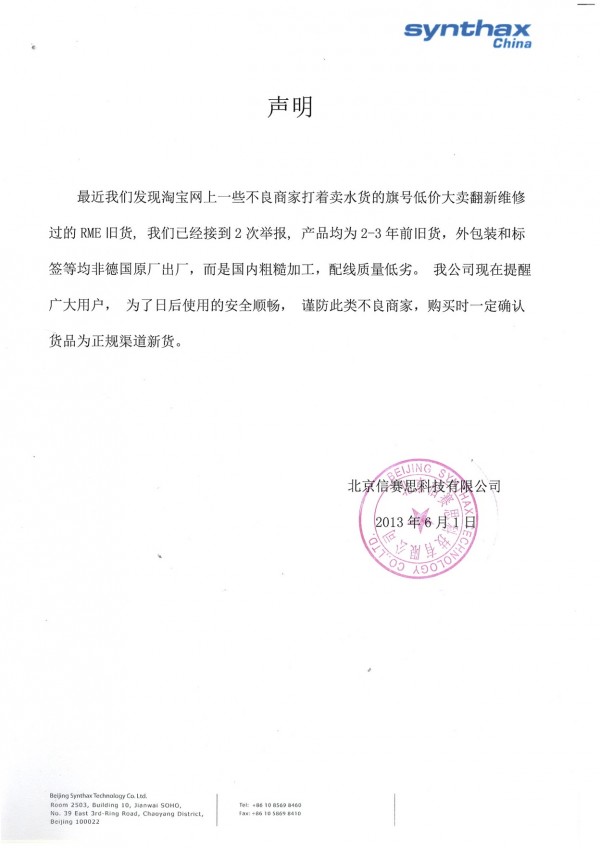 [導(dǎo)讀] 最近Synthax China發(fā)現(xiàn)淘寶網(wǎng)上一些不良商家打著賣水貨的旗號(hào)低價(jià)大賣翻新維修過的RME舊貨,已經(jīng)接到2次舉報(bào),均為2-3年前舊貨,國(guó)內(nèi)粗糙加工。