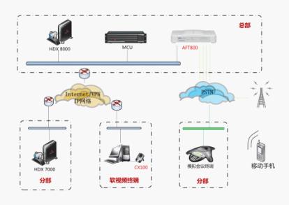 在總部機房部署Tenor AFT800語音網(wǎng)關,接入5條PSTN電話線路,通過IP網(wǎng)絡與視頻會議多點控制單元MCU進行Sip Trunk級聯(lián)。當召開視頻會議需要加入PSTN用戶時,可通過MCU使用Sip協(xié)議外呼議會者電話號碼邀請其加入會議,也可以讓與會者主動撥打接入語音網(wǎng)關的電話號加入指定ID的視頻會議。使用PC客戶端鍵入會議的人員配備CX100優(yōu)化PC聲音,達到更好的會議效果。