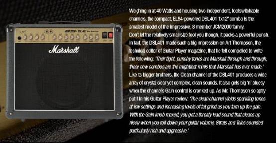 MARSHALL JCM2000-DSL401這款型號(hào)的音箱設(shè)計(jì)十分簡潔,前級(jí)采用4個(gè)ECC-83電子管,后級(jí)采用4個(gè)EL-84電子管以及一個(gè)12寸的揚(yáng)聲器,使其具有了強(qiáng)大的沖擊力,、體積上并不會(huì)因?yàn)椴捎眯∠潴w而不能滿足你的需要。這款型號(hào)的音箱與其他型號(hào)的DSL音箱相比最與眾不同的特點(diǎn)是它具備了3項(xiàng)踏板切換的組合,即“純干琴音色”“失真1”“失真2”!笆д1”和“失真2”相比在于后者具有了強(qiáng)度20dB的提升電路,通過你的踏板在2路失真切換的同時(shí)瞬間爆發(fā)出兇猛的音色。與最大體積的DSL音箱相比DSL-401干琴聲道可產(chǎn)生水晶般的音色,在干琴通道下隨著你的失真度(GAIN)的增益不斷提升,可產(chǎn)生出絕妙的BLUES音色。DSL401也以其前控制面板優(yōu)秀的品質(zhì)而著稱,即對(duì)揚(yáng)聲器的雙組(STANDBY&POWER)8 Ohm/16 Ohm阻抗雙向選擇,用于箱體的失真控制,通過踏板的控制可用于選擇箱體的失真。通過踏板控制還可選擇揚(yáng)聲器的DI輸出及混響(REVERB)開關(guān)。
