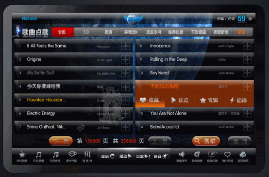 進入首頁,很清晰看到由K歌、酒吧、電影和營運服務(wù)四個模塊組成的V8【K探索】,這與小編見過的其它點歌系統(tǒng)有很大不同,其它系統(tǒng)看到的都是以K歌為主的各分類,而這個系統(tǒng)多了兩個主模塊酒吧和電影,不知道它們到底有哪里吸引我們的呢?動態(tài)的三維立體星球視頻詮釋了該版本涵義:探索KTV娛樂行業(yè)、探索科技創(chuàng)新、探索太空星際,顯示出了海媚人的創(chuàng)新精神,下面簡單介紹下使用過程: