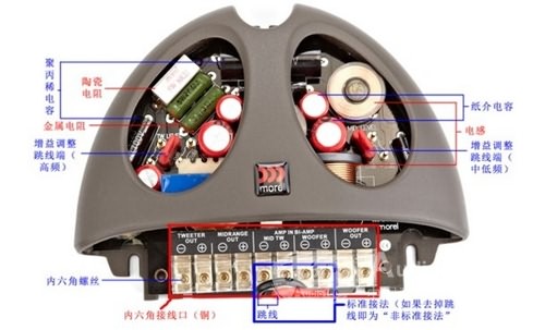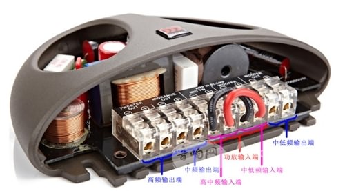在這個魚頭狀的分頻器中,最大的亮點就是它的設計非常靈活,即可以做被動分頻也可以做半主動分頻。構(gòu)造分為:高頻輸出端、中頻輸出端、功放輸入端(可分為高中頻輸入端和中低頻輸入端)、中低頻輸出端、跳線等構(gòu)成。