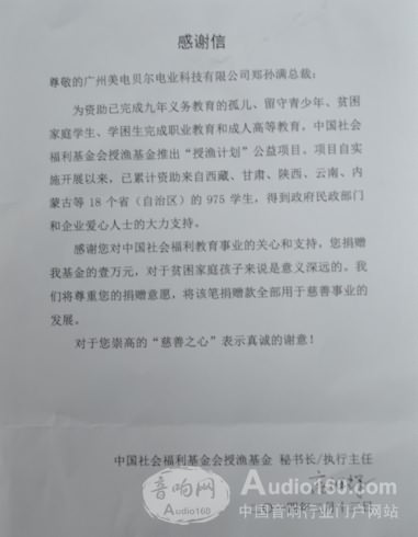 2014年2月,美電貝爾在中國社會福利基金會授漁基金推出“授漁計劃”公益項目中,捐款壹萬元,用以資助孤兒、留守青少年、貧困家庭學(xué)生、學(xué)困生完成職業(yè)教育和成人高等教育。