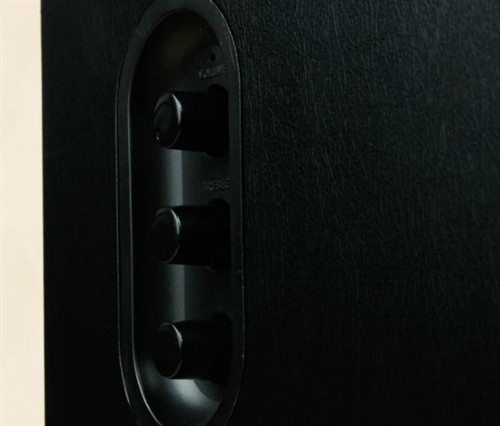 麥博H50BT細節(jié)之處也盡顯人性化的設計,設有3個調節(jié)旋鈕,可對調節(jié)音量、低音、高音增益等.音箱將音量調節(jié)旋鈕和低頻增益旋鈕都設計在箱體側面,凹槽式設計,有效降低旋鈕在側面的高度,便于操作.使用了旋鈕式設計,其旋轉的阻尼感適中,手感良好.