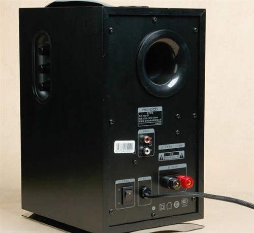 麥博H50BT音箱采取后置倒相管設計,用于增強低頻量感.電源開關、音頻輸入接口和副箱連接線均設置在背面.紅白兩色RCA音頻接口以及紅黑線柱的設計有利于用戶安裝帶來便利操作.同時在背部的另一側則是大量的散熱片和線材接口.