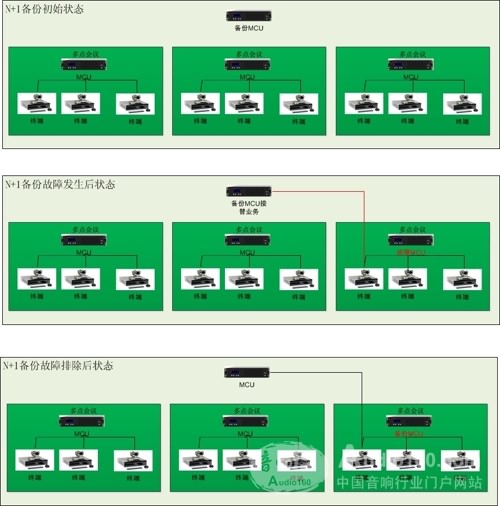 以N+1備份為例,智呈通過增加一臺空閑MCU對其他N臺MCU進(jìn)行備份,一旦其中一臺MCU出現(xiàn)故障,系統(tǒng)會自動發(fā)送消息給備份MCU,將故障MCU的任務(wù),比如會議、會議參數(shù)設(shè)置等,通過消息發(fā)送給備份MCU。在經(jīng)過極其簡單、短暫的切換后,備份MCU迅速接管故障MCU的工作,保證會議持續(xù)穩(wěn)定進(jìn)行。而故障MCU在故障排除后,會自動變?yōu)閭浞軲CU,進(jìn)行安全保障工作。