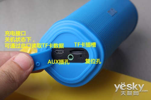 左側(cè)是機(jī)身的接口部分,掀開皮套,可以看到里面設(shè)計(jì)有一個(gè)Micro USB充電接口、AUX外接音源接口、TF卡插槽、RESET復(fù)位鍵。右側(cè)是倒U型排列的按鍵設(shè)計(jì),因?yàn)檫@款藍(lán)牙音箱自帶了1200毫安的鋰電池,因此還有著電量顯示的指示燈。