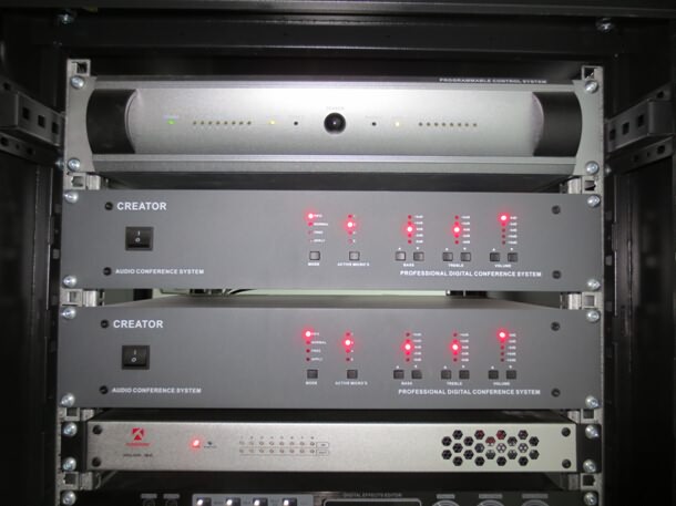 該指揮中心研判室與處警室運用了CREATOR快捷數(shù)字化有線會議系統(tǒng)的核心部分——會議系統(tǒng)控制主機CR-M4101及桌面式純發(fā)言主席/代表單元CR-CR-M4102/04B,采用32bit高速浮點、DSP處理技術(shù),可配合電話耦合器,可以進行遠程電話會議;配合攝像跟蹤系統(tǒng)(如該會議室安裝的吸頂式球形攝像機)可實現(xiàn)攝像自動跟蹤;提供帶寬20Hz~20KHz完美音質(zhì)。