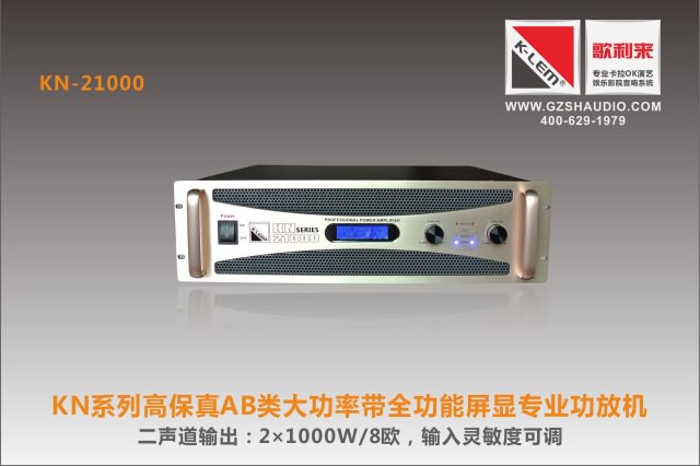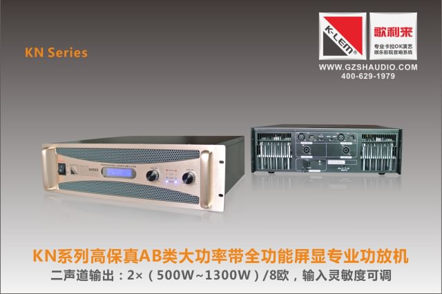 臺(tái)灣K-LEM(歌利來(lái))品牌于2014年3月推出KN系列高保真AB類二大功率帶全功能屏顯二聲道專業(yè)音頻功放機(jī)。它是一款“土豪金”鋁合金面板的3U專業(yè)功放機(jī),共4個(gè)型號(hào):KN-2500、KN-2800、KN-21000、KN-21300。
