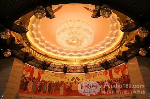 建筑二層為接引堂,其正北方是長22米、寬4米的壁畫《萬國來朝》,描繪了武周時期八方來朝、四海稱臣的盛世景觀;頂部裝飾的“飛鳳”水晶燈,暗喻武周時期空前提升的女性地位。此外,二層還會安排表演和講座來介紹武周的歷史概況。但圓形的建筑構造和強烈的裝修視覺效果使得傳統(tǒng)的常規(guī)揚聲器很難滿足現場的擴聲要求。天創(chuàng)中電技術員通過多次與客戶溝通和產品對比,最終選用了RENKUS-HEINZ ICL-FR有源可導向陣列揚聲器。ICL-FR有源可導向陣列揚聲器箱體非常纖細,可完美的隱藏在壁畫兩側,可針對現場的實際情況調節(jié)揚聲器發(fā)聲點和波束的數量與指向,使得聲能量集中在聽眾區(qū),而不是擴散到整個廳堂的墻壁、天花上,有效避免過多的反射聲,顯著提高了語言清晰度與傳聲增益。同時在外圍布置了19只具有BroadBeam(恒定指向性)專利技術的SoundTube RS 600i開放式揚聲器,使得聲場分布更加均勻。功放選用了Ecler DPA系列功放,該系列功放具有SPM專利技術和智能防失真電路,使得功放穩(wěn)定性好,動態(tài)足,音質高。而拾音部分則選用了beyerdynamic MCS 50有線會議系統(tǒng),該系統(tǒng)操作簡單,人聲還原準確飽滿,語言清晰度高,是會議討論、學術報告等場所的理想之選。