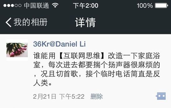 為什么說(shuō)這兩個(gè)場(chǎng)景有需求?首先,每天在這兩個(gè)場(chǎng)景下的時(shí)間有限,但能保證人們幾乎天天都必不可少。其次,在這兩個(gè)場(chǎng)景下的用戶基本在做著洗澡、炒菜、刷碗等動(dòng)作,這時(shí)他們處于一個(gè)并不需要太專心,但是又比較放松的心理狀態(tài),把音樂切入進(jìn)來(lái)想必能讓使用者在這個(gè)環(huán)境下放松不少。第三,在這些場(chǎng)景下聽音樂不太需要音效,因?yàn)槌橛蜔煓C(jī)、噴頭、在廚衛(wèi)中扮演的“重要角色”,導(dǎo)致只要把產(chǎn)品音量做大就行,這降低了創(chuàng)業(yè)的制作門檻。