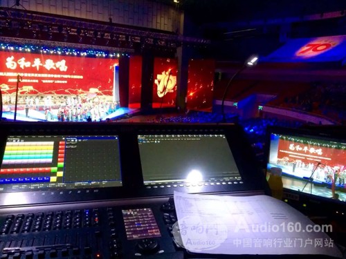 除了《勝利與和平》文藝晚會,當晚在上海也舉行了“為和平歌唱”——紀念中國人民抗日戰(zhàn)爭暨世界反法西斯戰(zhàn)爭勝利七十周年2015年上海市民文化節(jié)•金秋閔行上海市民合唱展演。整場演出的LED系統,包括舞臺主屏幕、舞臺兩邊側翼LED屏幕,也由2臺HOG4 控制。