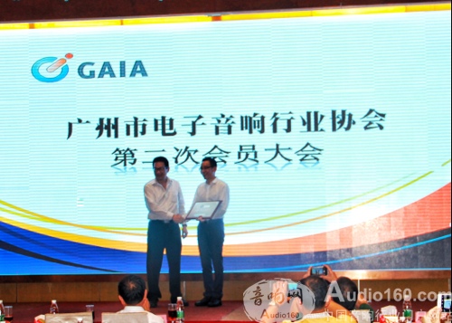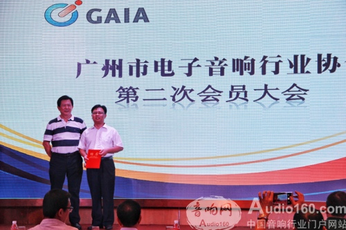 中國電子音響行業(yè)協(xié)會副秘書長黃桅、廣州市工信委工業(yè)處黃志勇調(diào)研員為第二屆理事單位授牌。