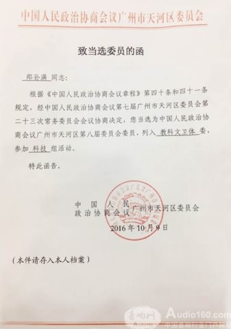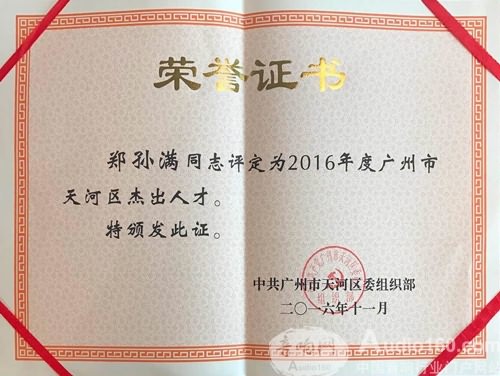 現(xiàn)通過發(fā)布公告、資格審查和組織評審等程序,2016年11月10日,天河區(qū)委組織部公示2016年天河區(qū)杰出人才、優(yōu)秀人才入選名單,美電貝爾總裁鄭孫滿憑借對天河區(qū)經(jīng)濟(jì)社會發(fā)展以及企業(yè)創(chuàng)新方面的突出貢獻(xiàn),榮獲“2016年度廣州市天河區(qū)杰出人才”榮譽(yù)稱號。
