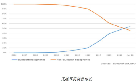 根據(jù)美國的零售市場的數(shù)據(jù)顯示,藍(lán)牙耳機(jī)的銷售大量增加。2016年6月,美國無線耳機(jī)銷售的總額超過有線耳機(jī)的總額。隨著iPhone7上的物理音頻插孔消失,以及最新的Beats耳機(jī)中使用的蘋果最新的W1無線芯片,無線耳機(jī)的銷售額仍將繼續(xù)上升。