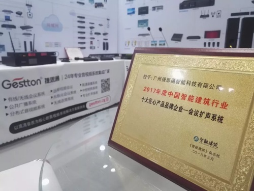 Gestton捷思通榮膺“2017年度中國智能建筑行業(yè)十大匠心產(chǎn)品品牌企業(yè)——會議擴聲系統(tǒng)”;