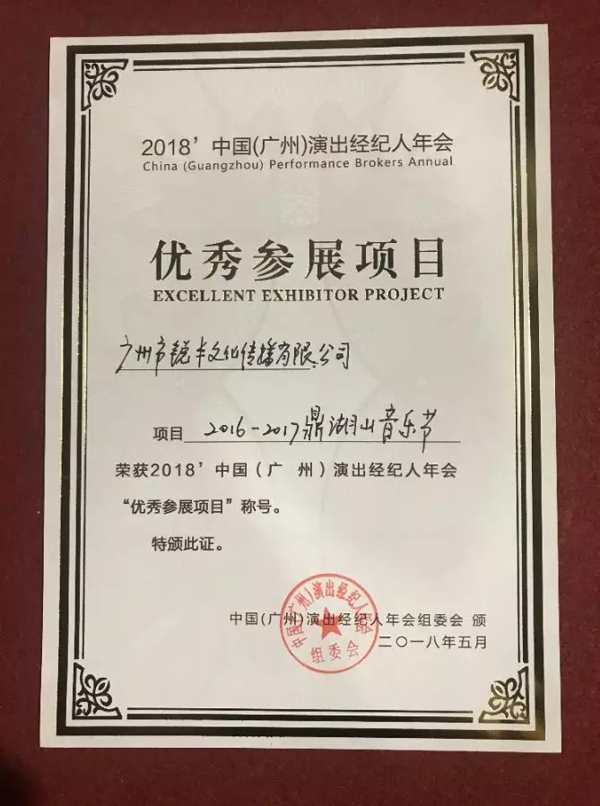 5月9日,在2018中國(廣州)演出經(jīng)紀人年會的評選中,由鼎湖區(qū)人民政府和銳豐文化共同舉辦的鼎湖山音樂節(jié)成功斬獲“優(yōu)秀參展項目”稱號。2016、2017兩屆鼎湖山音樂節(jié)累計參與人數(shù)突破20萬人次,并在舉辦期間多次登上了五一新浪微博全國熱搜榜第二位,擴大了鼎湖區(qū)和肇慶市的城市知名度,對提升城市形象和推動音樂旅游產(chǎn)業(yè)轉(zhuǎn)型發(fā)展起了促進作用。