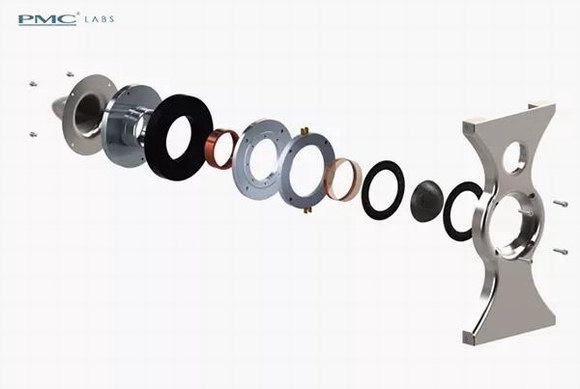 這是75mm凸盆中音單體的分解圖,可以看到背後是一個(gè)尖錐狀的鋁合金密閉箱室,可引導(dǎo)背波往後傳導(dǎo),末端內(nèi)設(shè)有吸震材料,可吸收多餘震動(dòng),進(jìn)而加以消弭。