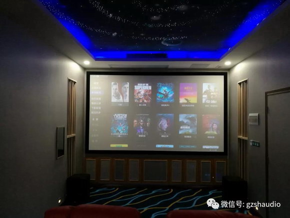 采用全隱藏安裝設計,前墻設計一個深65cm的柜子,前置左中右音箱、電子設備全部隱藏安裝在柜子里,采用透聲畫框幕;
