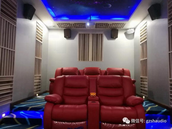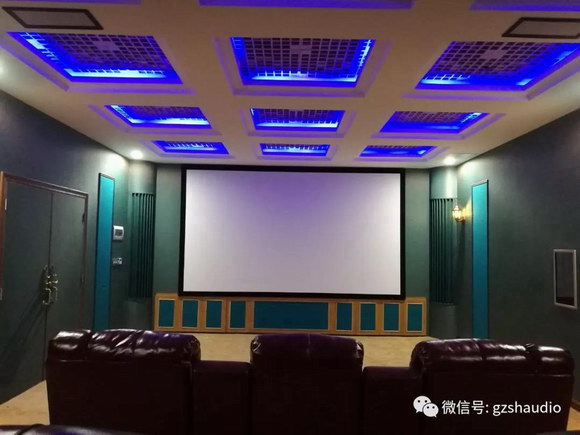 頂部采用12宮格裝修效果設計,每個格內裝4塊聲學材料,邊框內填10cm厚的隔音棉,外封9cm厚木夾板,6cm厚的硅酸鈣板,刷白處理,另有4只星空通道音箱位;