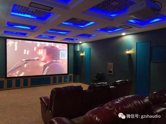 采用半隱藏安裝設計,前墻設計一個深60cm的柜子,前置左中右音箱、電子設備全部隱藏安裝在柜子里,采用透聲畫框幕;