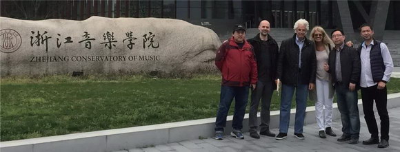 項目設(shè)計方國內(nèi)聲學專家郭明(左一),WSDG的創(chuàng)始人John Storyk(左三)攜團隊和傳新科技技術(shù)總監(jiān)王宇菲(右二)在浙江音樂學院合影