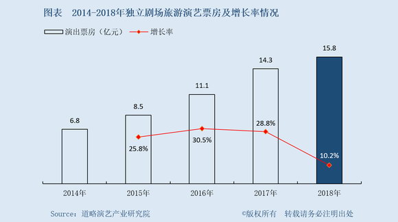 獨(dú)立劇場(chǎng)旅游演出票房增長(zhǎng)10%,增速放緩。2018年,獨(dú)立劇場(chǎng)旅游演藝票房達(dá)15.8億元,同比2017年僅增長(zhǎng)1.5億元,增長(zhǎng)率僅為10.2%,增速明顯放緩,低于旅游演藝整體增長(zhǎng)。