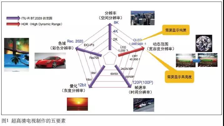 2018年9月,國(guó)家廣播電視總局印發(fā)《4K超高清電視技術(shù)應(yīng)用實(shí)施指南(2018版)》,適用于3 840×2 160分辨率、50幀/秒幀率、10 bit量化精度、BT.2020色域、高動(dòng)態(tài)范圍(HDR)的4K超高清電視節(jié)目制作、播出、編碼、傳輸系統(tǒng)與終端的適配。BT.2020標(biāo)準(zhǔn)主要從以下五個(gè)要素對(duì)超高清電視系統(tǒng)進(jìn)行規(guī)范:分辨率、幀率、量化值、色域、高動(dòng)態(tài)范圍(見圖1)。這五個(gè)方面的變化,直接導(dǎo)致UHD節(jié)目的生產(chǎn)難度大大增加。以下對(duì)這些難點(diǎn)逐一分析。