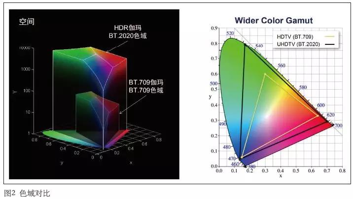 從HD電視到UHD電視明顯變化體現(xiàn)在兩個(gè)方面,色域由REC.709變?yōu)锽T.2020,動(dòng)態(tài)范圍由SDR(標(biāo)準(zhǔn)動(dòng)態(tài)范圍)提升為HDR。因?yàn)檫@兩點(diǎn)變化,直接導(dǎo)致整個(gè)生產(chǎn)系統(tǒng),從前期拍攝到后期制作需要全面升級(jí),重新規(guī)劃。