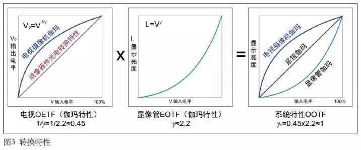 在目前的電視節(jié)目生產(chǎn)過程中,視頻信息經(jīng)歷了OETF(光電轉(zhuǎn)換特性)、EOTF(電光轉(zhuǎn)換特性)兩個(gè)過程,這兩個(gè)過程相乘就是整個(gè)系統(tǒng)的轉(zhuǎn)換特性O(shè)OTF(光光轉(zhuǎn)換特性),如圖3所示。其中,攝像機(jī)伽瑪為OETF;監(jiān)視器伽瑪為EOTF;系統(tǒng)的伽瑪為OOTF,即攝像機(jī)伽瑪和監(jiān)視器伽瑪?shù)某朔e。對(duì)于SDR電視系統(tǒng),系統(tǒng)伽瑪= 1/2.2×2.4 ≈ 1.1。