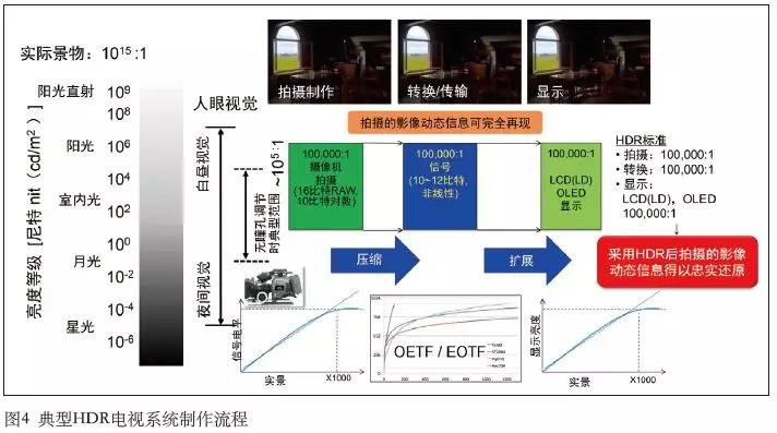 在SDR內(nèi),無法再現(xiàn)人眼所見的全部亮度動(dòng)態(tài)范圍,電視再現(xiàn)的人物或者主體亮度大約控制在幾十尼特,超過100 nt的高亮部分無法正常顯示,導(dǎo)致部分高亮區(qū)域的灰度層次丟失(過曝)。HDR則建立了比SDR更大的色彩/亮度體系,并改變系統(tǒng)的傳輸函數(shù),從而再現(xiàn)更大的色域和更高的亮度動(dòng)態(tài)范圍,達(dá)到人眼可識(shí)別的最大對(duì)比度100 000:1。典型HDR電視系統(tǒng)制作流程見圖4。