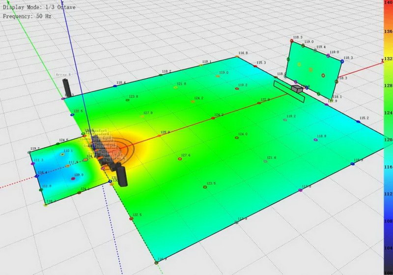 根據(jù)現(xiàn)場實際情況,我們調(diào)整了設計,使用了人工計算的弧形加心形的復合超低陣列,舞臺上的低頻得到了很好的控制,且觀眾區(qū)的低頻覆蓋更加均勻。