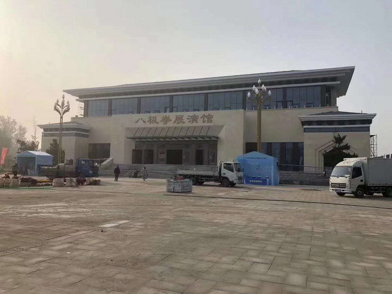 孟村八極拳文化研學(xué)基地東側(cè),一座占地9000平米,建筑面積5000平米、上下三層的新中式風(fēng)格展演館蔚然矗立。展演館訓(xùn)練大廳總面積3000余平米,分別設(shè)有舞臺(tái)、中心表演及訓(xùn)練區(qū)固定看臺(tái)及移動(dòng)看臺(tái),可容納觀眾2000余人。可承接大型武術(shù)賽事以及表演訓(xùn)練、研討、傳承等各項(xiàng)社會(huì)活動(dòng)。