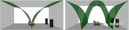 聲波遇上堅硬平面產(chǎn)生反射的現(xiàn)象,其原理和光波從鏡子反射是一樣的,有色箭頭代表從喇叭放出來的直接音,其他箭頭代表打向聽者的硬面反射音。