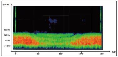 從陣列的前方開(kāi)始(0°方向),發(fā)出一個(gè)脈沖信號(hào),手持測(cè)試傳聲器,以陣列為圓心,半徑為2 m逆時(shí)針繞圓測(cè)量,結(jié)束一周的環(huán)繞測(cè)試后再發(fā)出一個(gè)脈沖信號(hào),測(cè)試結(jié)束。圖17為測(cè)量角度示意圖,圖18為實(shí)驗(yàn)光譜圖,其中顏色的深淺程度標(biāo)志聲壓級(jí)大小。