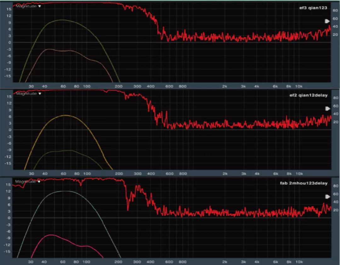 第四步:依次打開(kāi)第2只、第1只揚(yáng)聲器,并且各加入3.1 ms(1/4波長(zhǎng)對(duì)應(yīng)的時(shí)間)和6.3 ms(1/2波長(zhǎng)對(duì)應(yīng)的時(shí)間)的延時(shí),使3只揚(yáng)聲器的相位曲線(xiàn)重合。
