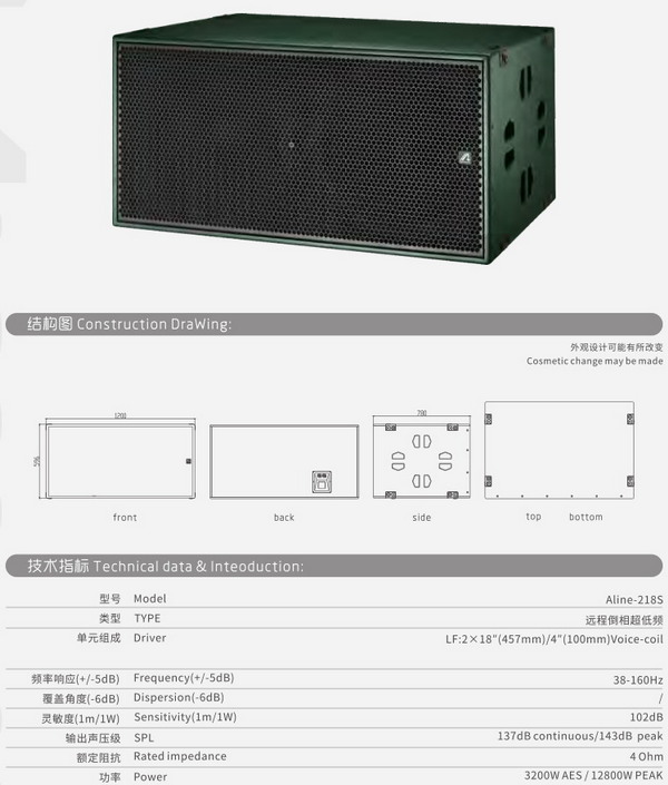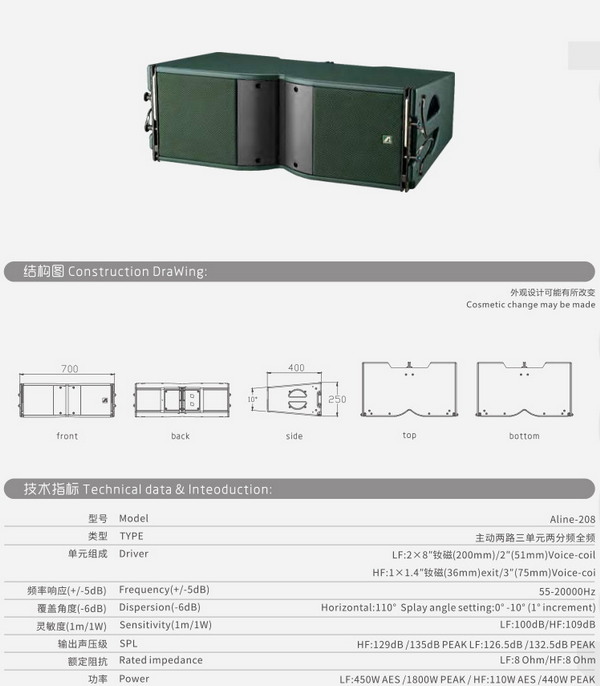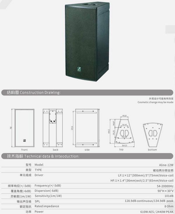 Aline系列是專為更高要求中大型室內外場所擴聲需求推出的線性陣列系統(tǒng),全球范圍嚴格篩選單元及配套元器件,配合精準的波導相位塞技術,專門設計的三點式吊掛系統(tǒng),高強度不銹鋼連接件,吊裝簡單,受力均勻,避免吊件自身碰撞雜音。精選15mm和18mm的優(yōu)質樺木原料制造箱體,能最大程度地減少動態(tài)狀態(tài)下箱體的諧振。部分內置無源分頻保護線路采用法國SCR HI-FI級電容 ,高純度無氧銅電感,嚴格篩選,精確裝配,奠定了產品品質的堅實基礎。后接線板兩個并聯(lián)的特定定制鍍金NL4MP插座,特種鋼網配合特制透聲海綿或網布,在保證了聲音的有效傳輸情況下,提供了更好的單元外保護。