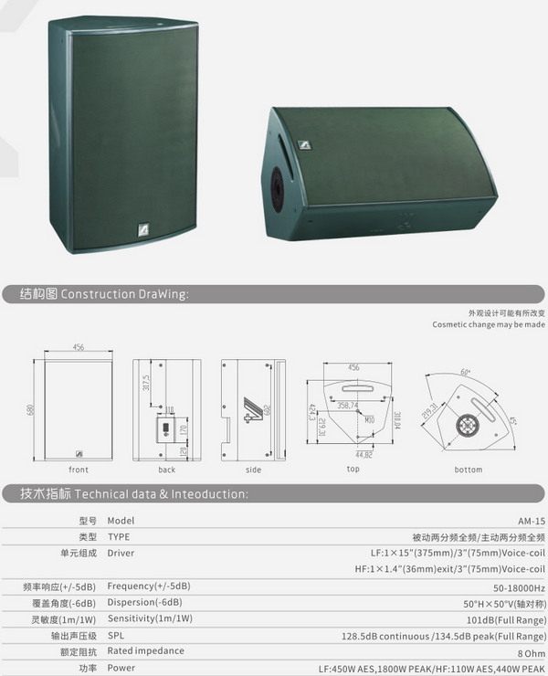 AM系列是一種先進的同軸結構設計,結構中含有一個固定對稱指向性圓錐形波導管。內部單元為歐洲頂級單元廠商定制的復合聚酯振膜壓縮高頻單元和防水低頻單元,軸對稱50°恒指向性號角,能夠完美解決常規(guī)同軸音箱射程不夠問題。