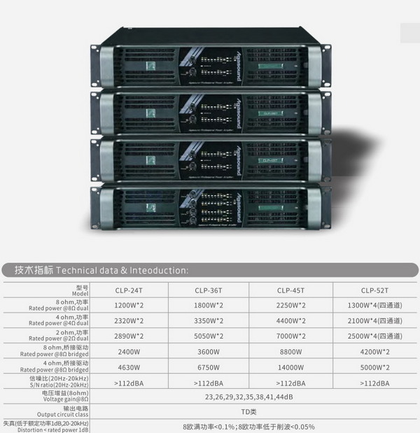 CLP系列功放是專門針對體育場館、演出、劇場、酒吧、演藝吧等大型擴聲場所設計的,功率大、重量輕、低失真、頻響寬的純后級開關電源系列功率放大器,適用于對音質有較高要求的擴聲系統(tǒng)。