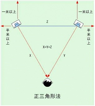 擺法:音箱要離開後墻至少1米以上,音箱與側(cè)墻的距離至少要半米以上。音箱間距與聆聽者的位置形成等成一個正三角形,音箱的向內(nèi)投射角度45度以上。聆聽位置不可貼墻,至少要留一米的距離。