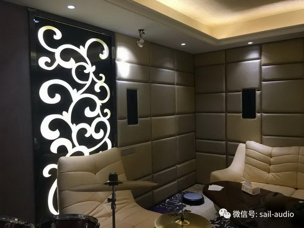 將安裝環(huán)繞音箱部分的軟包全部拆除,采用透聲布的方案來把音箱全部隱藏起來。透聲布采用接近墻面米黃色軟包的顏色搭配,F(xiàn)場拆除后發(fā)現(xiàn)環(huán)繞音箱功能上不影響使用,可將環(huán)繞音箱保留,改造后繼續(xù)使用。