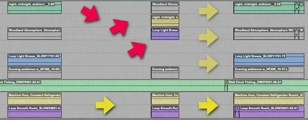 環(huán)境聲制作部門的工程可以說是滿滿當(dāng)當(dāng),像一個(gè)龐然大物。交付工程的時(shí)候記得確保拿到Checkerboard軌,檢查工程中音頻塊排列有沒有問題,并且每次場景重復(fù)的時(shí)候,音頻塊順序是否相同。這個(gè)細(xì)節(jié)也同樣適用于SFX和聲音設(shè)計(jì)部門。Checkerboard每個(gè)場景音頻塊的正確順序。