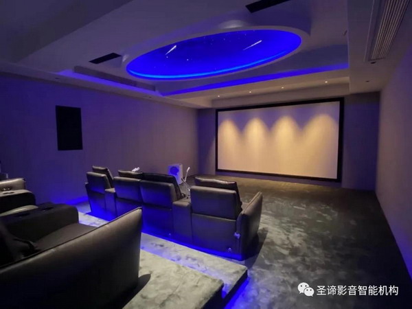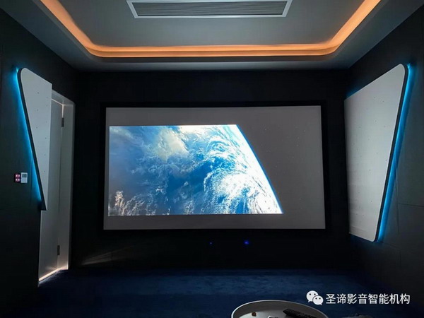 影院美觀上,建設了時下熱門的星空頂造型搭配變換的氛圍燈帶,邁聯(lián)智家的智能中控系統(tǒng)使得影院操作變得十分簡便。