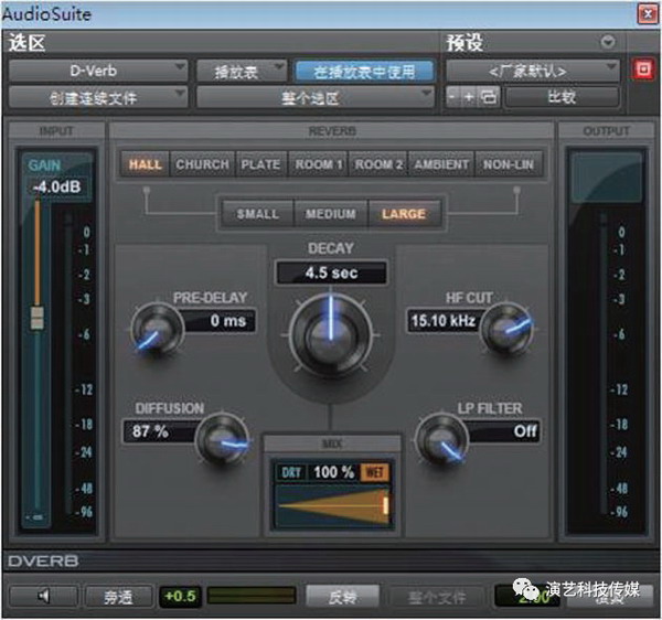 D-Verb是PRO TOOLS音頻工作站自帶的混響插件(見(jiàn)圖6)。調(diào)節(jié)的參數(shù)直接顯示在界面上,相對(duì)硬件效果器,操作上比較容易上手。直接用鼠標(biāo)就可以改變混響器的各種參數(shù)。