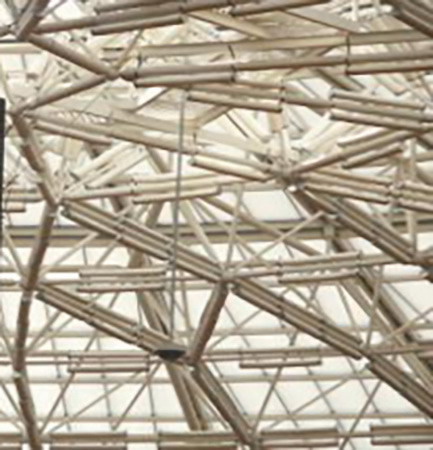 順著拱頂網(wǎng)架安裝條形吸聲體(吸聲條)。這方法曾用于廣州體育館和濟(jì)源市體育館(參見圖7)等,視覺效果甚佳,但價(jià)格昂貴,吸聲效果并不十分理想。