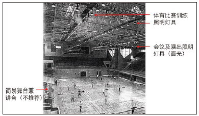 對(duì)于不設(shè)固定舞臺(tái)的營(yíng)業(yè)性大中型體育館,各類演出活動(dòng)一般都是由承辦方臨時(shí)搭建燈光系統(tǒng),體育館只需做好配電、承重和安裝條件等內(nèi)容設(shè)計(jì)即可。