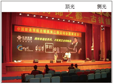 按照J(rèn)GJ/57—2000《劇場(chǎng)建筑設(shè)計(jì)規(guī)范》要求,舞臺(tái)區(qū)應(yīng)設(shè)置面光、耳光(圖14)、頂光、側(cè)光(圖15)等。在燈具的配置方面突出會(huì)議的特點(diǎn),同時(shí)又具備文藝演出的功能,如受資金的制約,最低限度的要求也必須設(shè)置面光和頂光。會(huì)議和演出舞臺(tái)特別強(qiáng)調(diào)面光的設(shè)置,自舞臺(tái)正前方的面光吊桿(或面光橋)以45°~50°投向舞臺(tái)。滿足各類會(huì)議、文藝演出以及拍攝電視和實(shí)況轉(zhuǎn)播要求的照明指標(biāo):參考廣電部GY 5045—2006〈電視演播室燈光系統(tǒng)設(shè)計(jì)規(guī)范〉,照度不低于2 000 lx,色溫3 050 k±150 k,顯色指數(shù)不小于85。隨著攝影設(shè)備的指標(biāo)提高,照度標(biāo)準(zhǔn)可適當(dāng)降低到1 500 lx。另外,如按高清電視的拍攝標(biāo)準(zhǔn)要求,顯色指數(shù)則提高到90。
