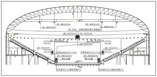 因此,其揚(yáng)聲器布局應(yīng)適當(dāng)參照劇場(chǎng)的規(guī)范,在舞臺(tái)口頂部設(shè)置主揚(yáng)聲器、在舞臺(tái)兩側(cè)設(shè)置拉聲像揚(yáng)聲器、在臺(tái)口附近設(shè)置舞臺(tái)返送(監(jiān)聽)揚(yáng)聲器等。如受資金的制約,最低限度的要求也必須在舞臺(tái)口兩側(cè)設(shè)置主揚(yáng)聲器。