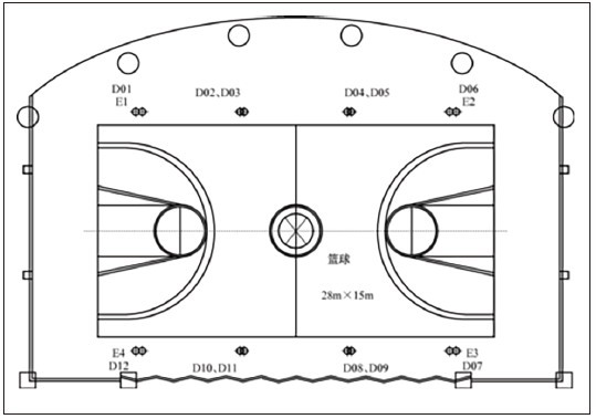 燈具布局及型號(hào)選擇見圖18(籃球場(chǎng)平面及燈具布局圖),共設(shè)置1 500 W MZ金屬鹵化物燈具12臺(tái)(圖18中的D01~D12)作為比賽場(chǎng)地的基礎(chǔ)照明,另設(shè)置1 500 W石英鹵鎢燈具4臺(tái)(圖18中的E1和E4)作為出口區(qū)的輔助照明(本案例為早期設(shè)計(jì),尚未推廣LED燈具)。安裝高度均為18 m。應(yīng)用燈具照明設(shè)計(jì)的專用軟件分別對(duì)清潔模式