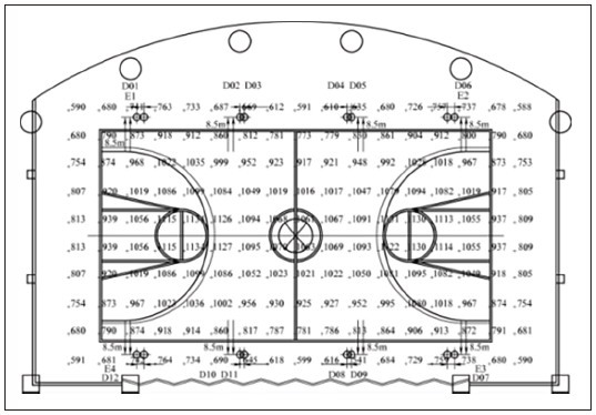 該館比賽大廳呈橢圓形,廳內(nèi)最大高度42.39 m,有效體積約為331 021 m³,內(nèi)表總面積約38154.62㎡(無活動(dòng)看臺(tái)時(shí)),相應(yīng)觀眾席位有18 000人,每座容積比約18.4 m³,體積界面比為8.58,場(chǎng)內(nèi)平均自由程為34.7 m。其建聲設(shè)計(jì)在控制調(diào)整混響時(shí)間的同時(shí),重點(diǎn)考慮消除回聲和長(zhǎng)延遲反射聲,為擴(kuò)聲系統(tǒng)創(chuàng)造一個(gè)良好的建聲環(huán)境。
